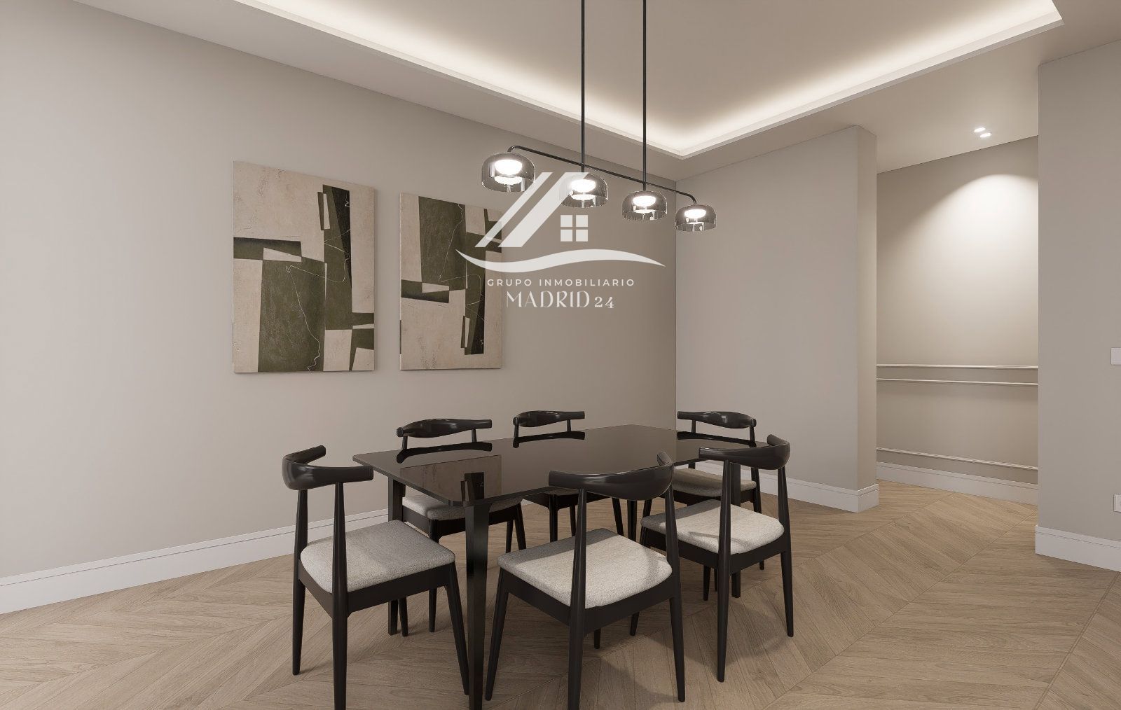 - Zona Social (Salón-Comedor): Un espacio diáfano "open plan" con suelos de madera, molduras decorativas en paredes y mobiliario de diseño contemporáneo.