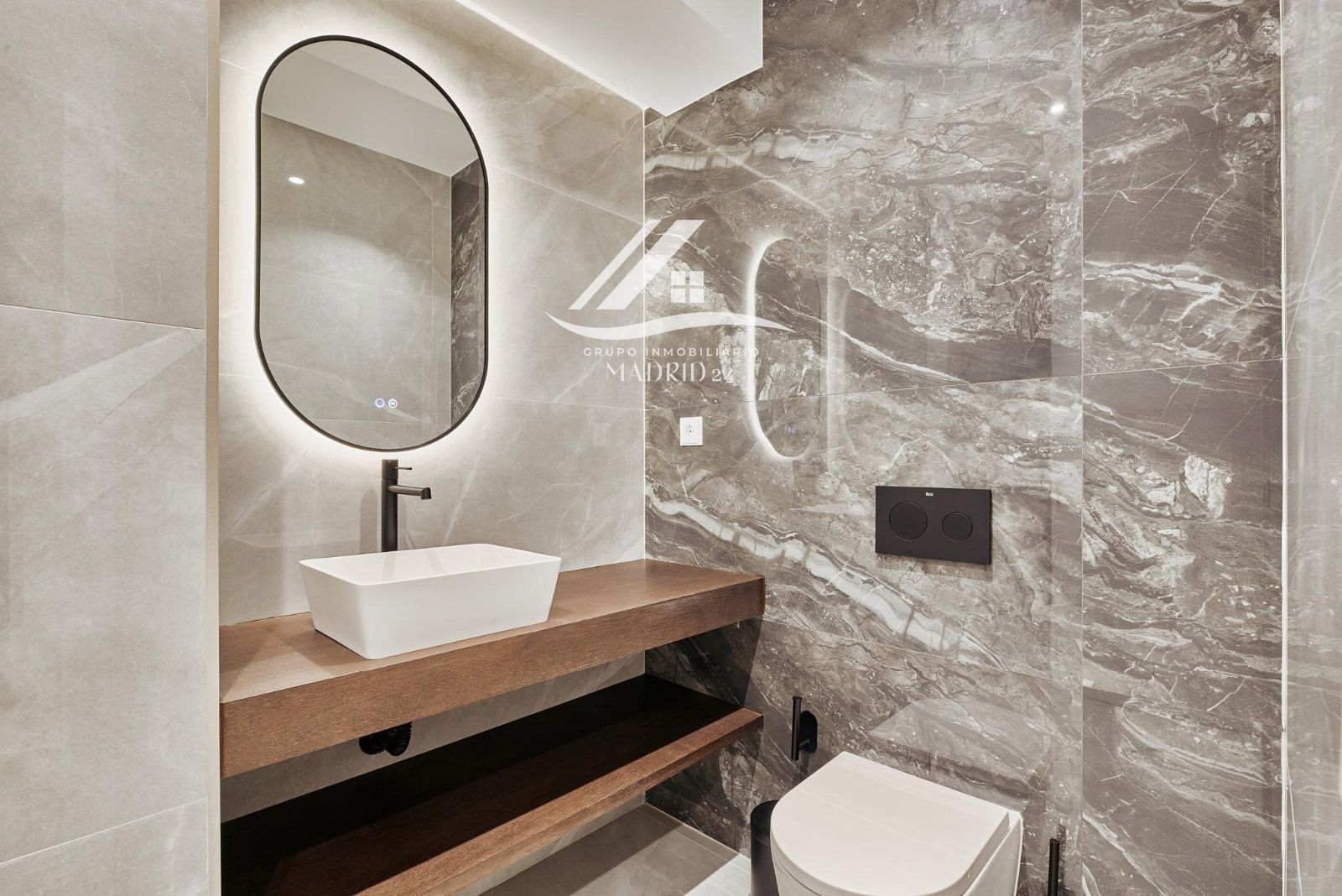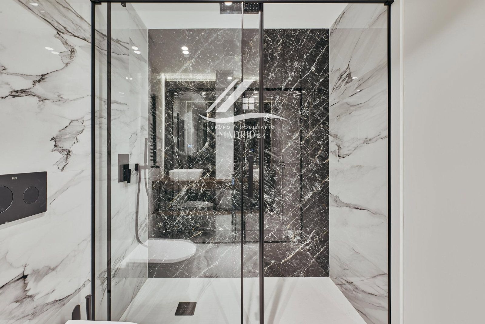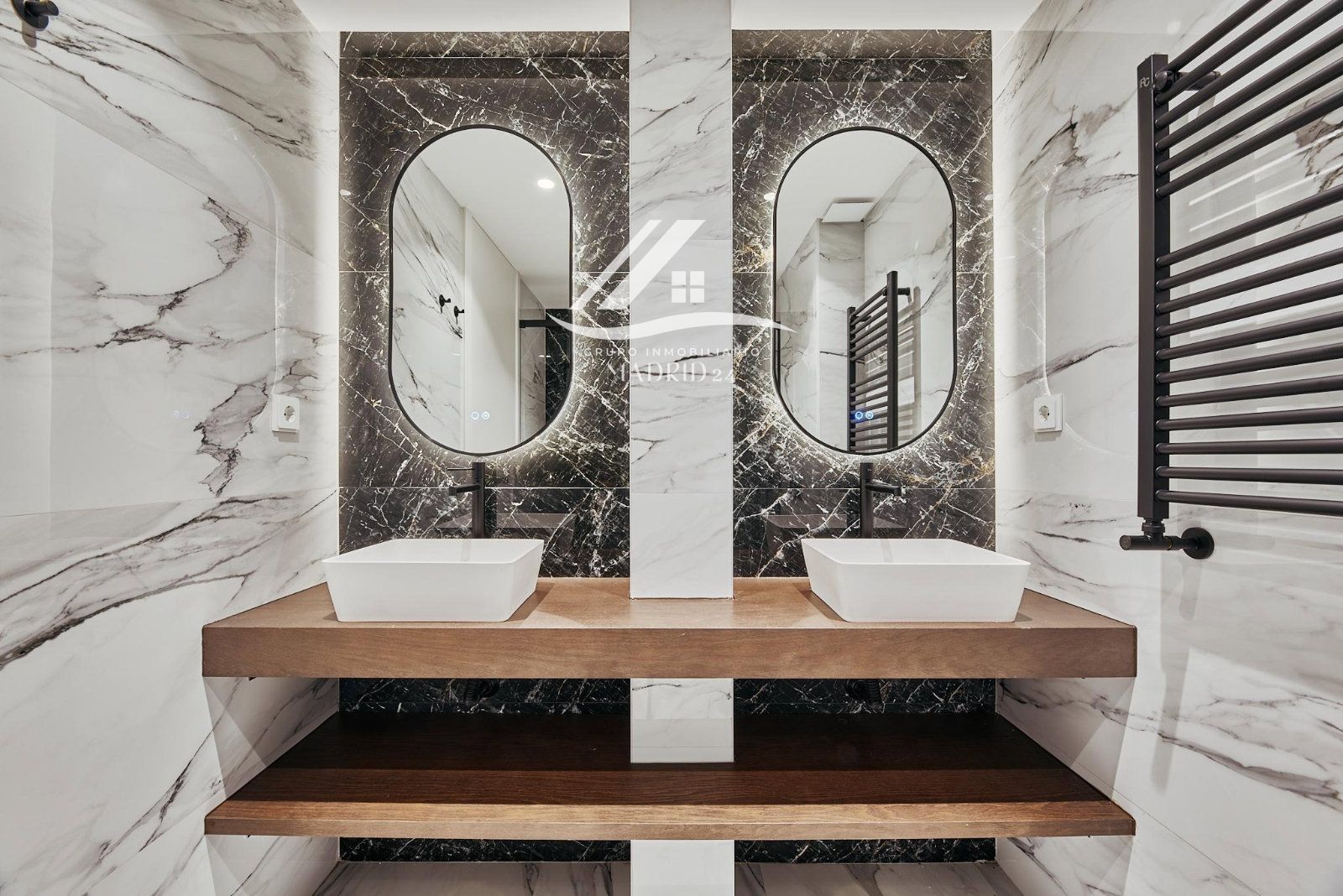 🚿 Baños Spa: Estética de mármol, espejos retroiluminados y acabados en negro mate para una experiencia de hotel 5 estrellas.