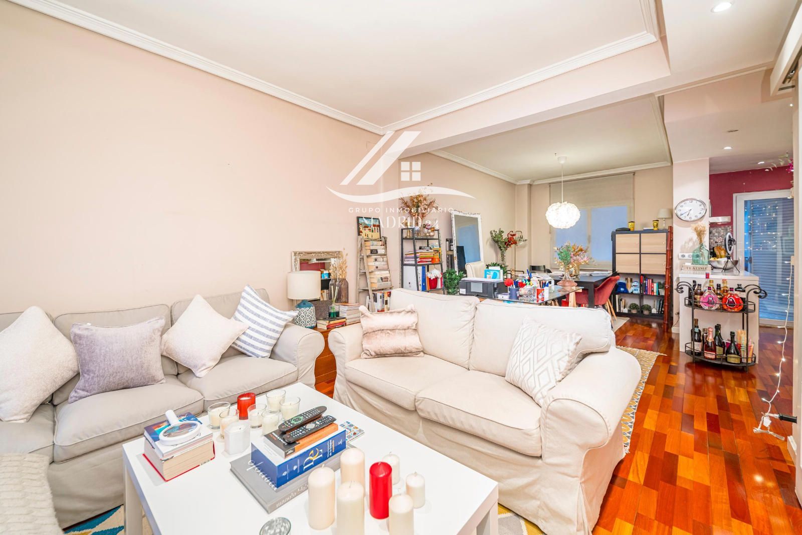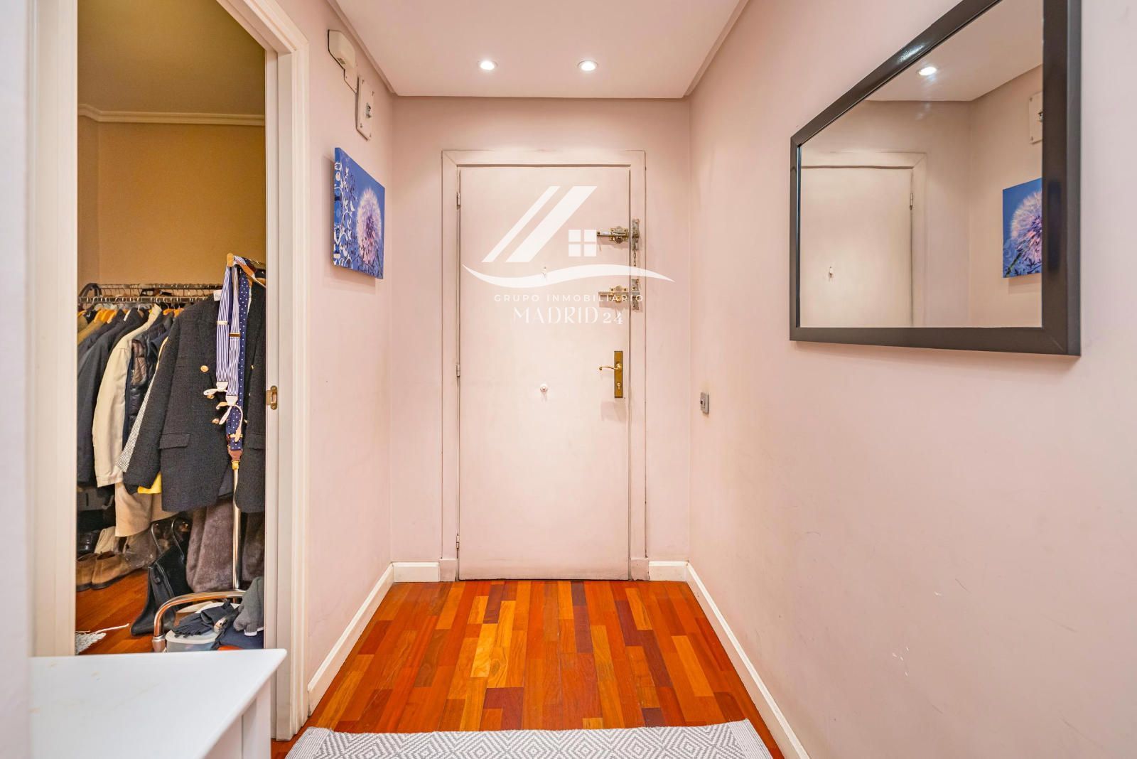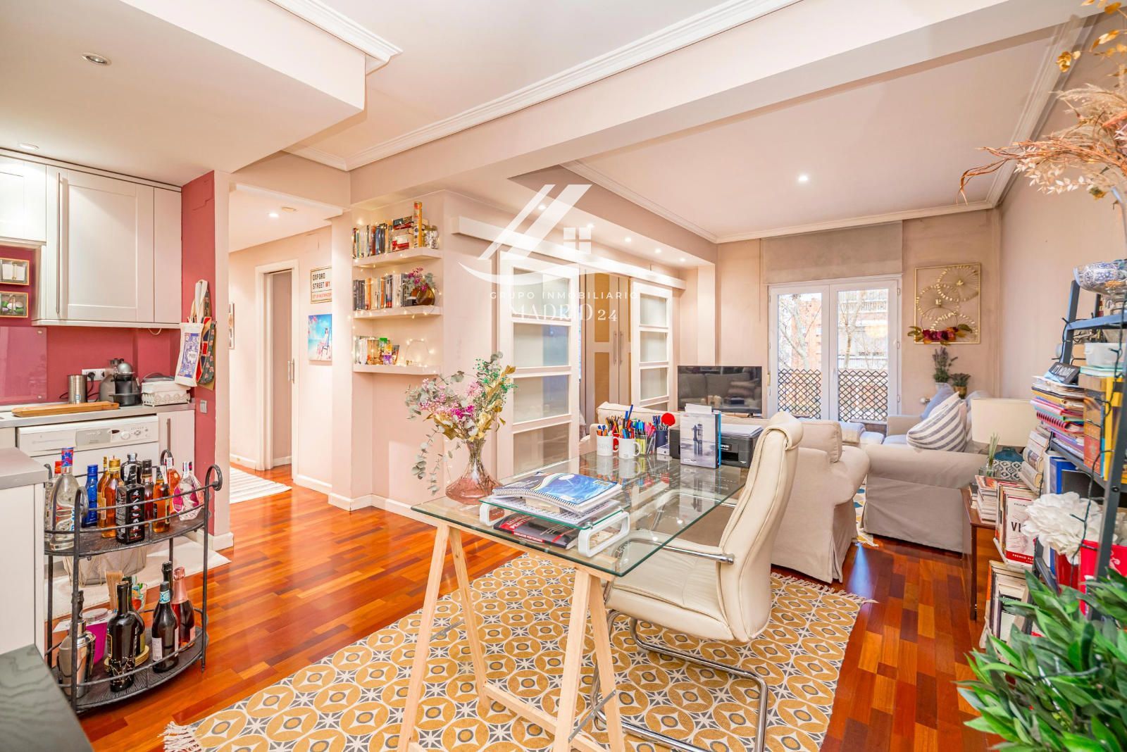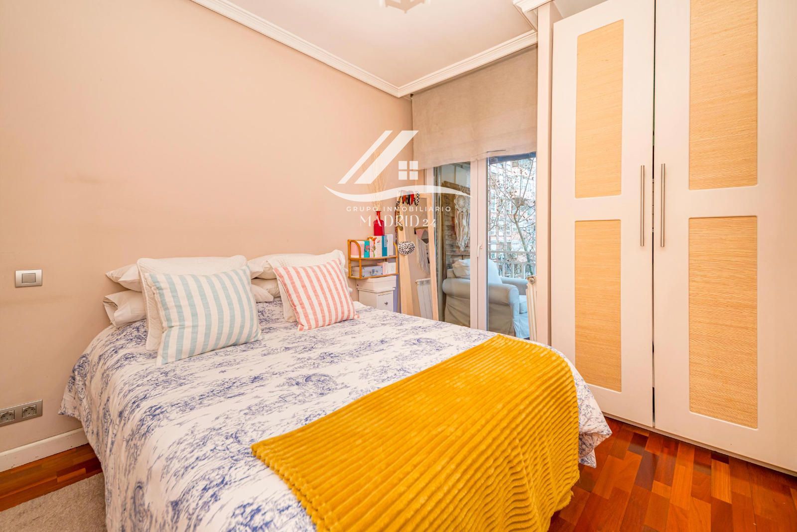 El piso se encuentra en excelente estado de conservación, y entre sus acabados destacan los suelos de tarima de madera, armarios empotrados y ventanas de aluminio lacadas en blanco, que aportan luminosidad natural y un ambiente cálido y moderno.
