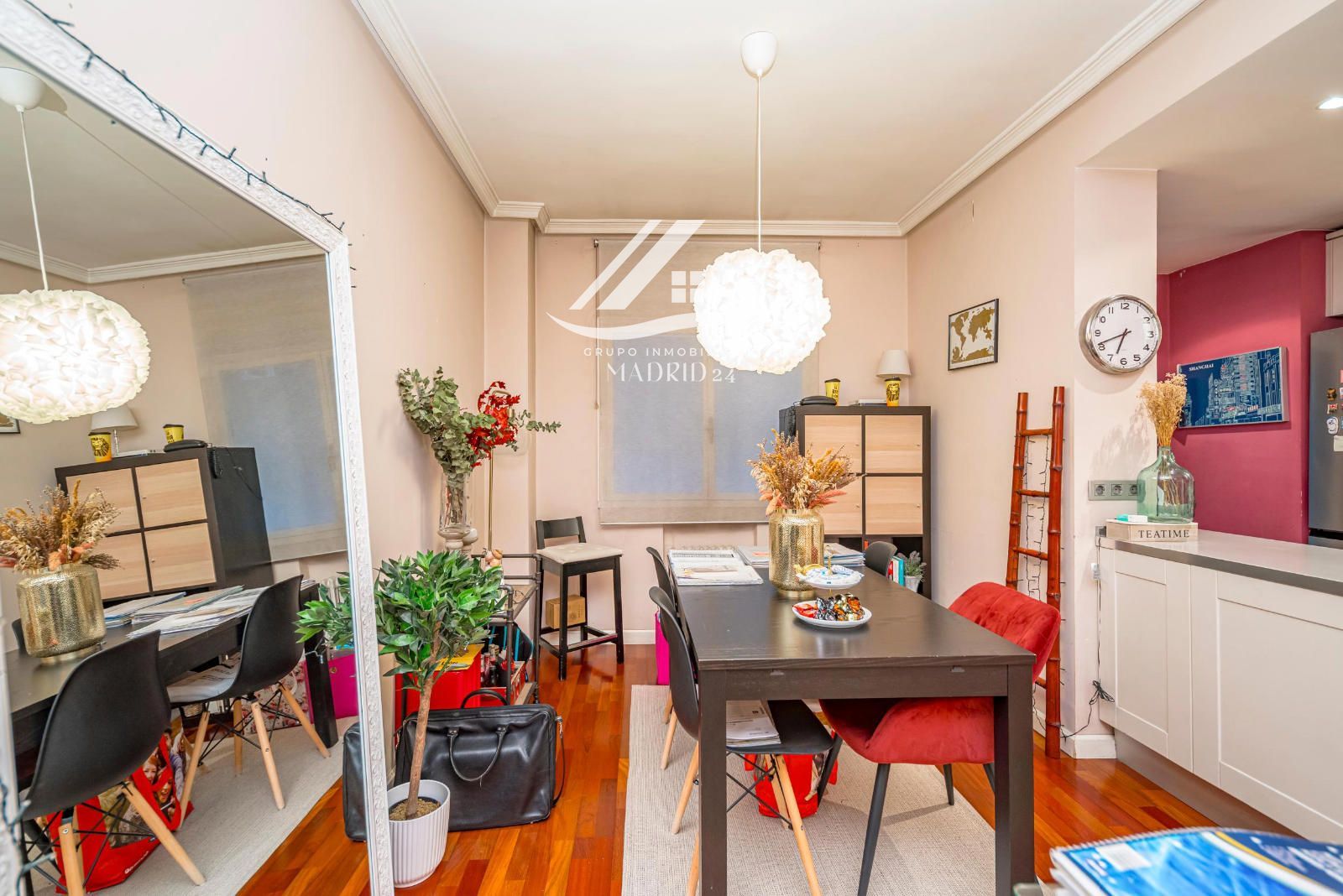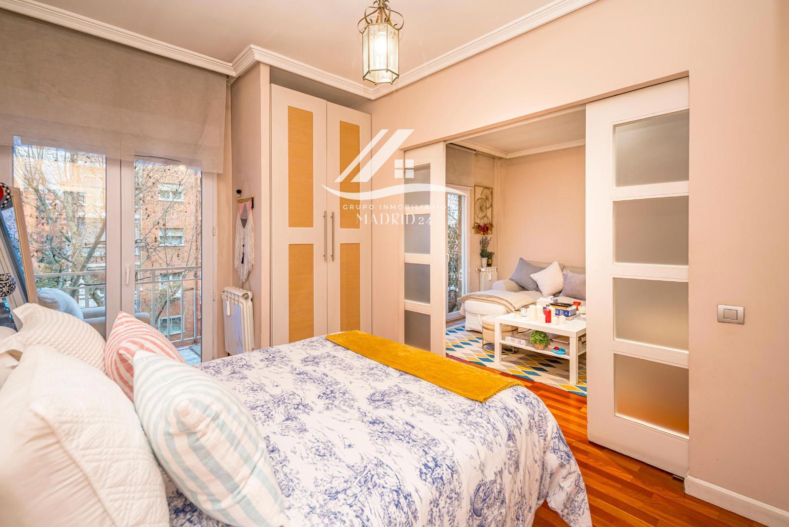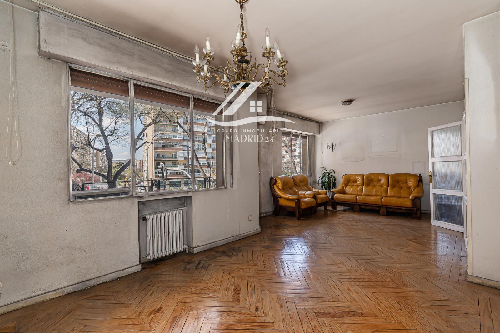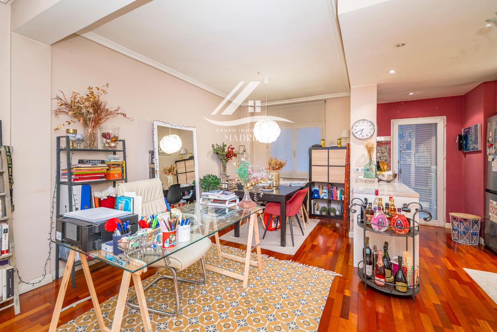 El piso se encuentra en excelente estado de conservación, y entre sus acabados destacan los suelos de tarima de madera, armarios empotrados y ventanas de aluminio lacadas en blanco, que aportan luminosidad natural y un ambiente cálido y moderno.