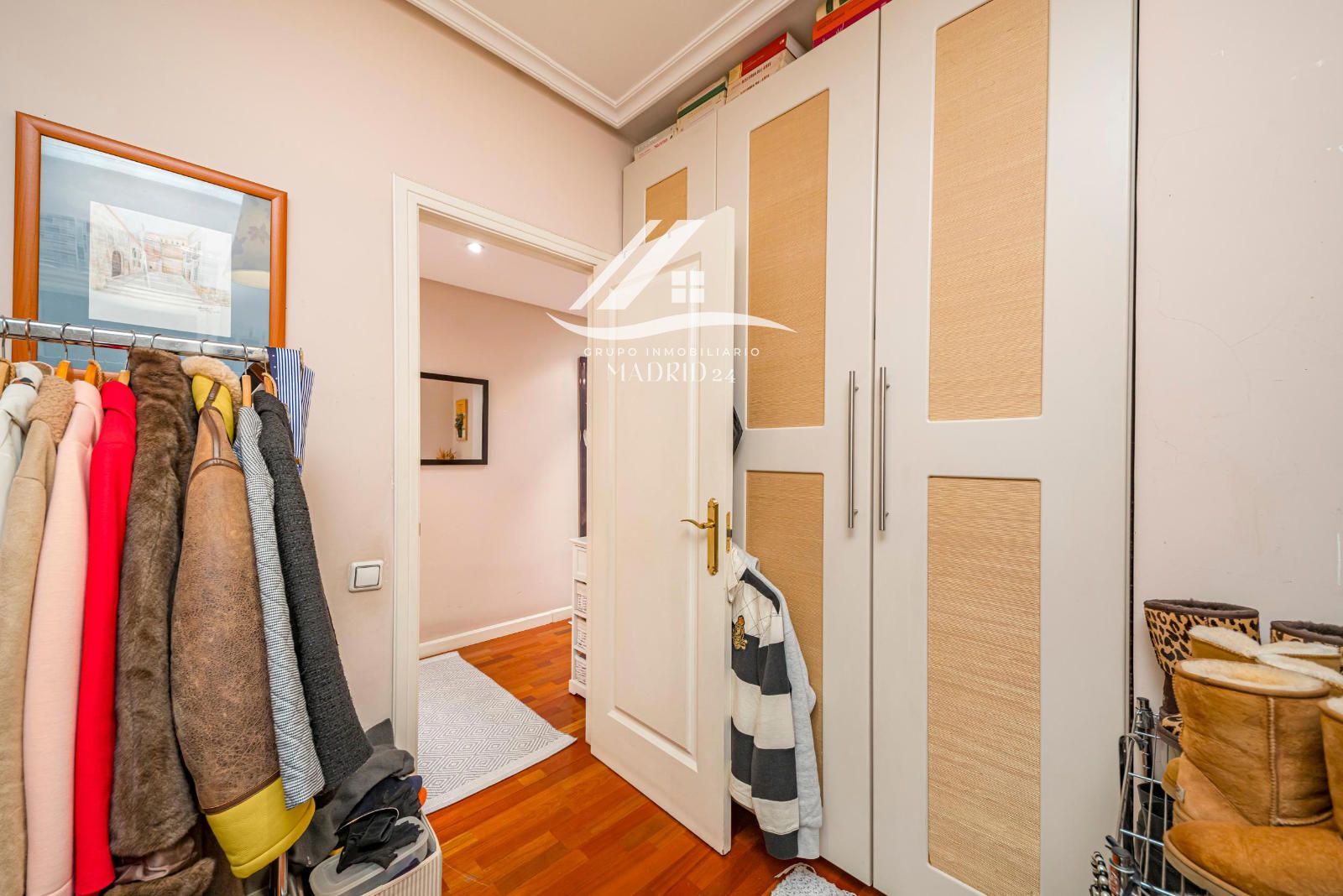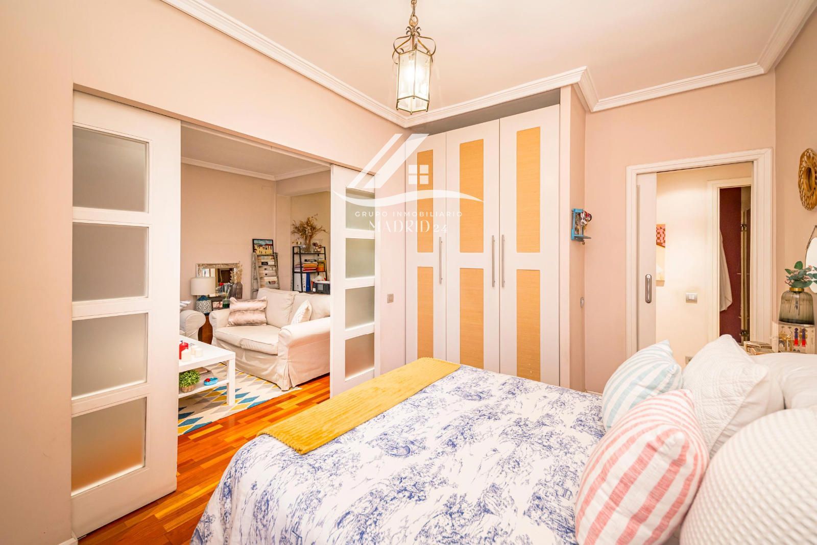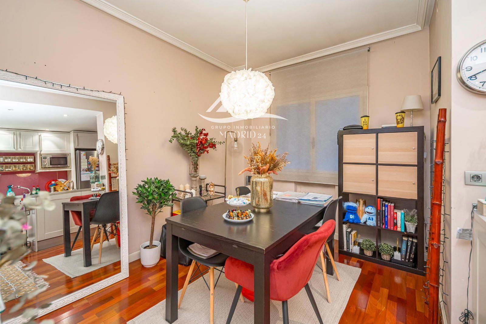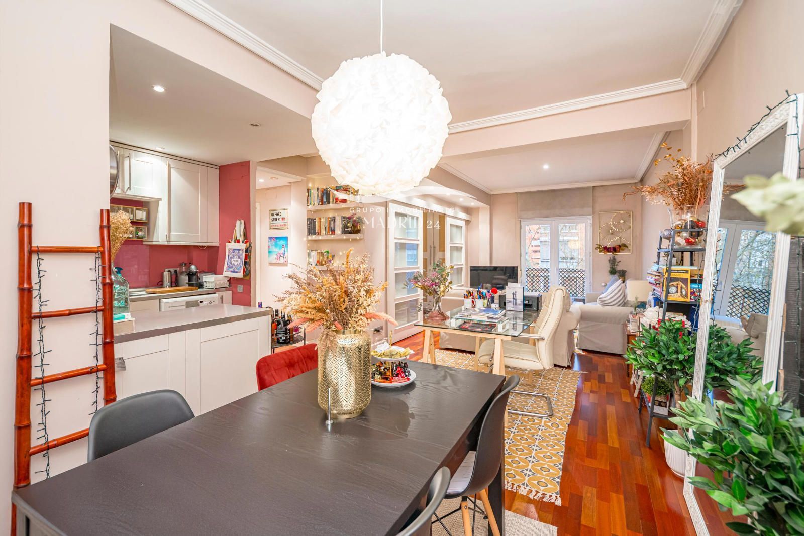 El piso se encuentra en excelente estado de conservación, y entre sus acabados destacan los suelos de tarima de madera, armarios empotrados y ventanas de aluminio lacadas en blanco, que aportan luminosidad natural y un ambiente cálido y moderno.