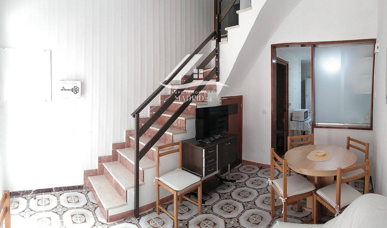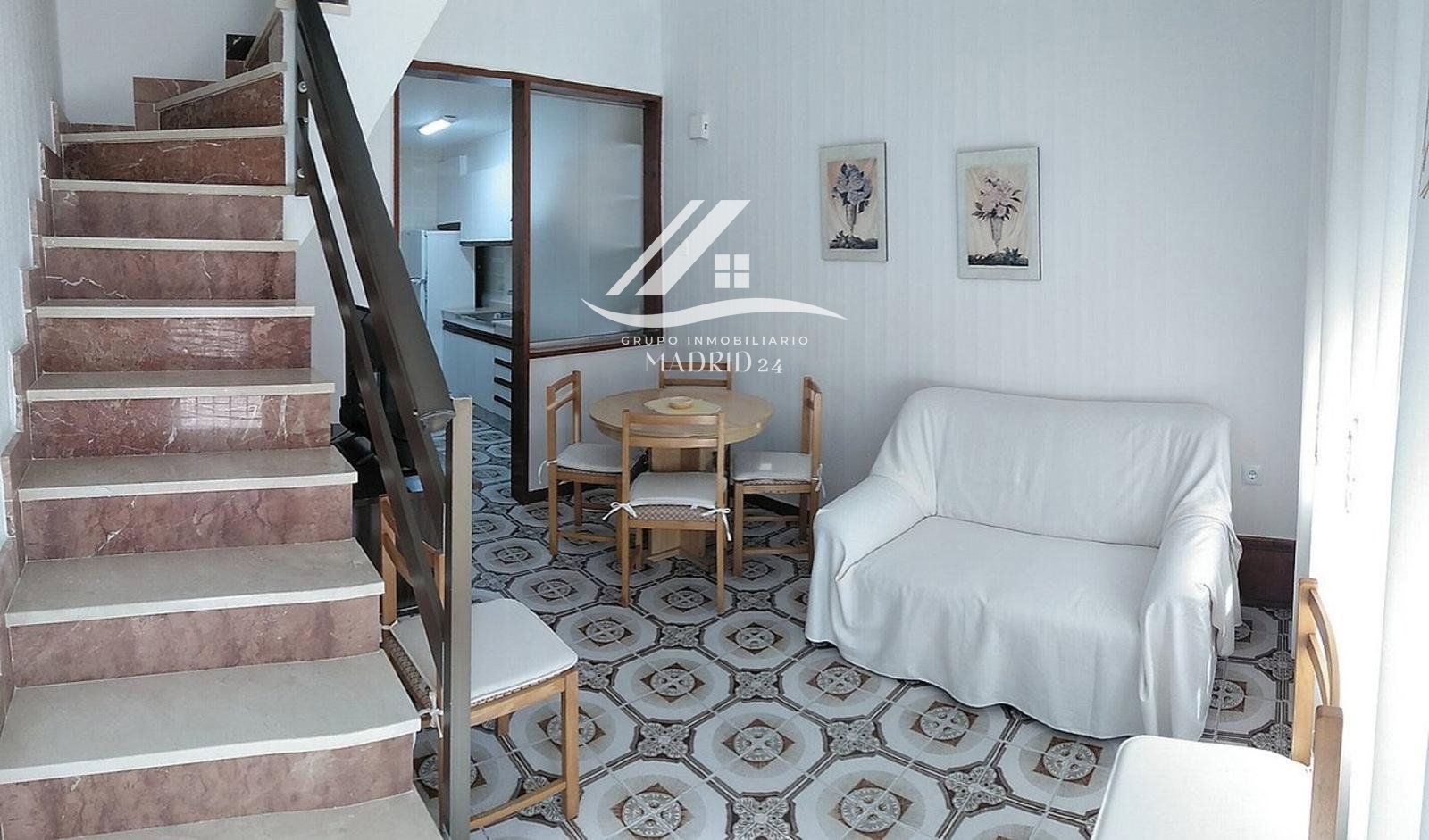 Salón-Comedor: Un área acogedora con suelos de baldosa hidráulica decorativa. Cuenta con un sofá de dos plazas y una mesa de comedor circular.