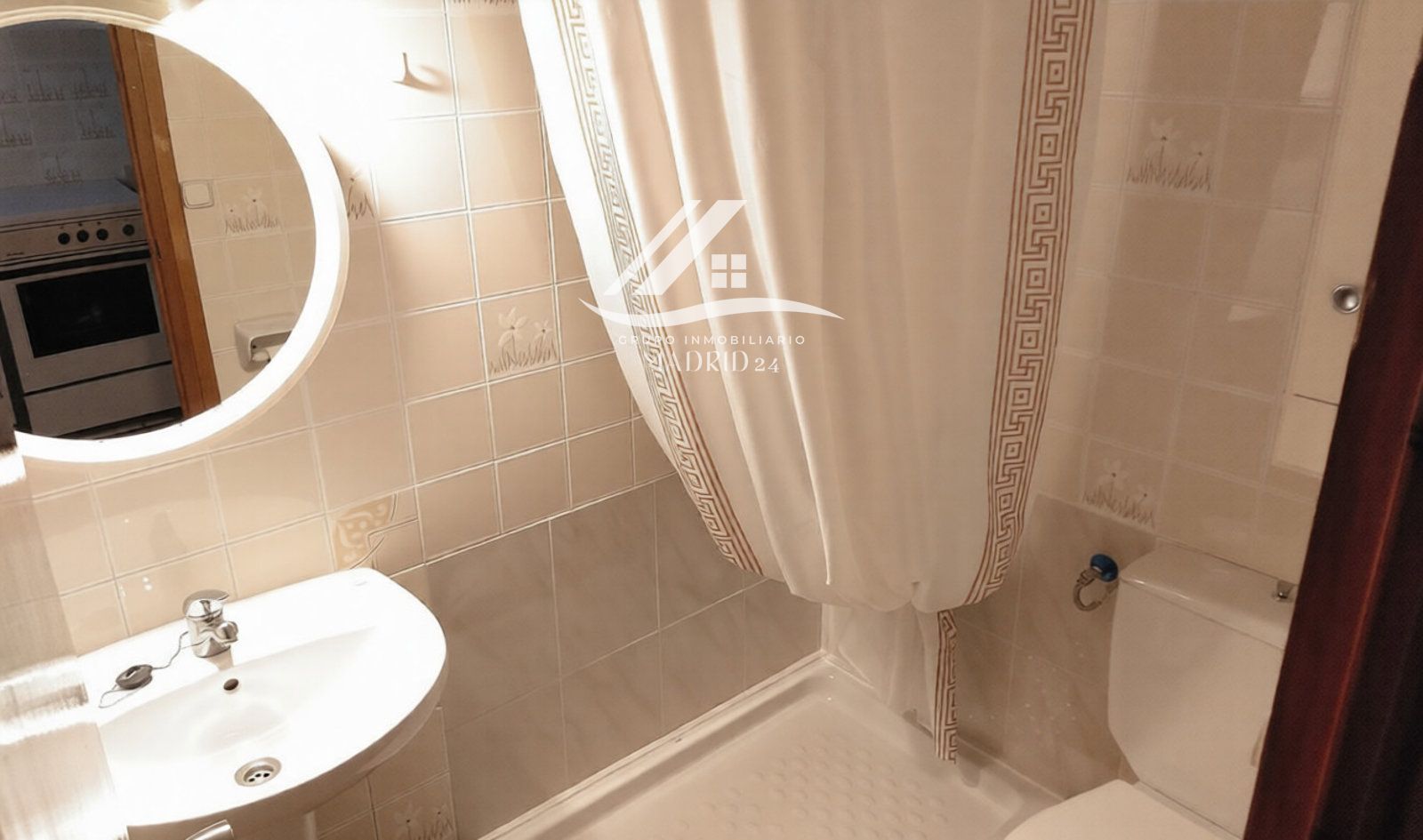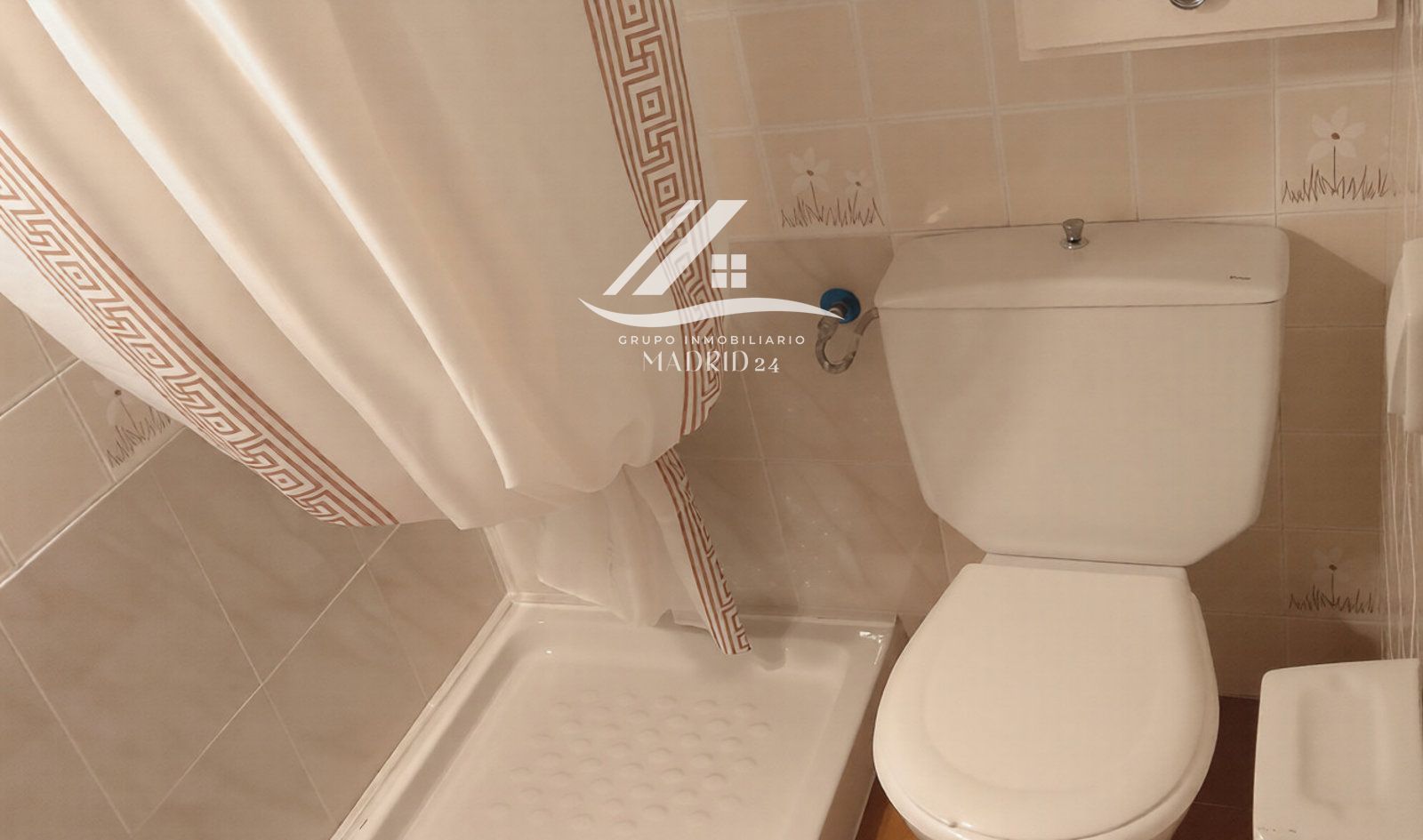 Cuarto de Baño: Funcional, con paredes alicatadas, sanitario de porcelana y plato de ducha con cortina protectora.