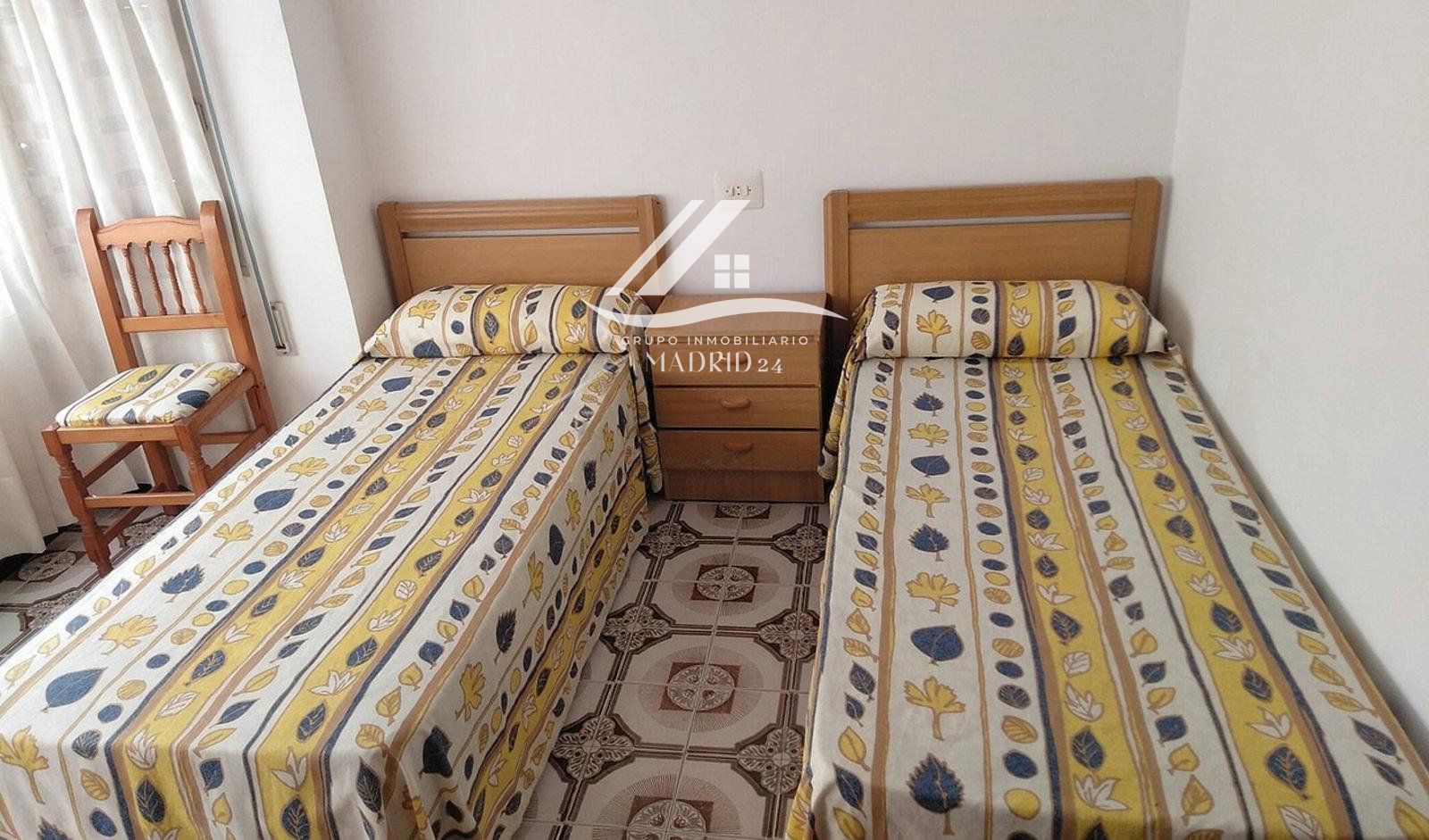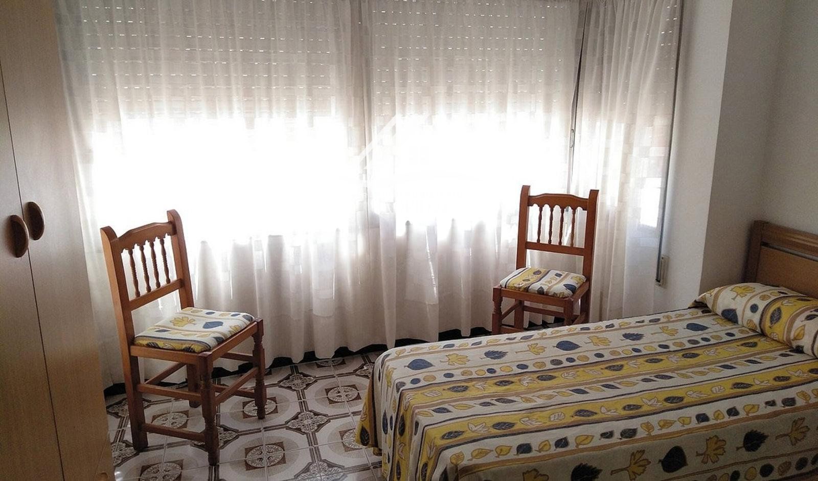 Dormitorio 1: Equipado con dos camas individuales, mesita de noche central y grandes ventanales que aportan luminosidad.