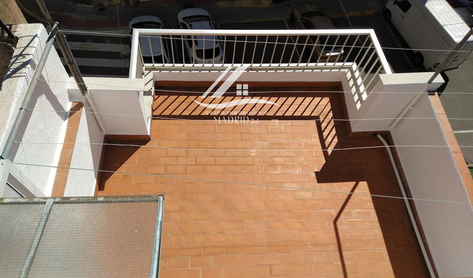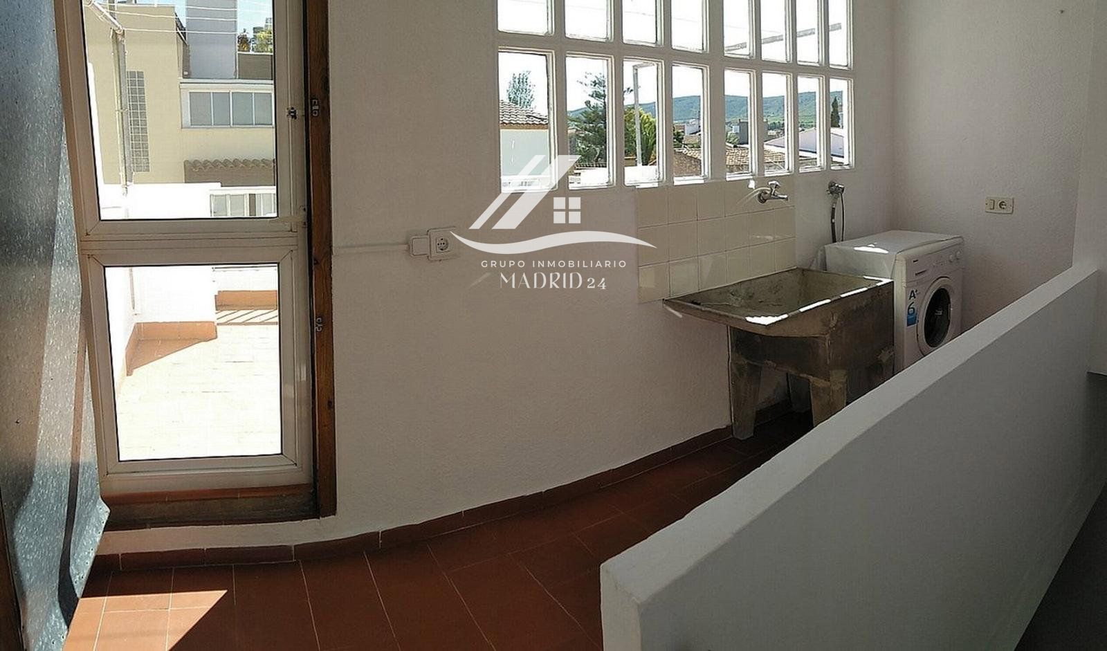Lavadero y Terraza: Zona dedicada a la colada con lavadora y fregadero antiguo de cemento. Acceso directo a una terraza exterior con vistas despejadas al entorno urbano y las montañas.